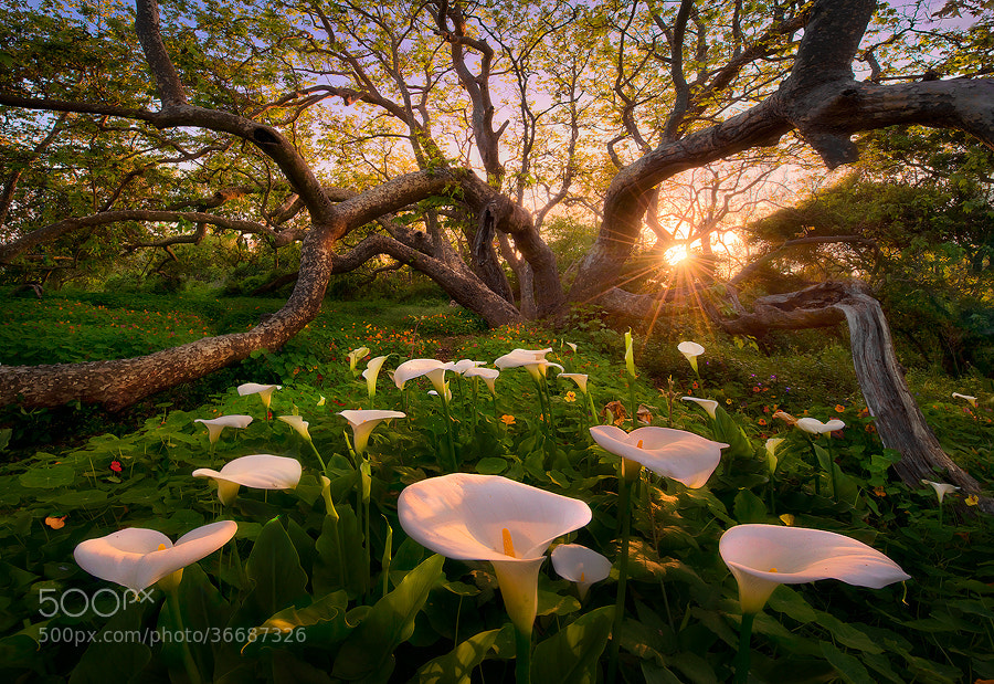 The photographer is Marc Adamus, who strives for sharp colors and wide, natural landscapes. Aside from expert composition and shallow compression, what really brings out the beauty in this image is the way the sun highlights the foreground flowers, giving them a unique texture that only “magic hour” lighting can provide.